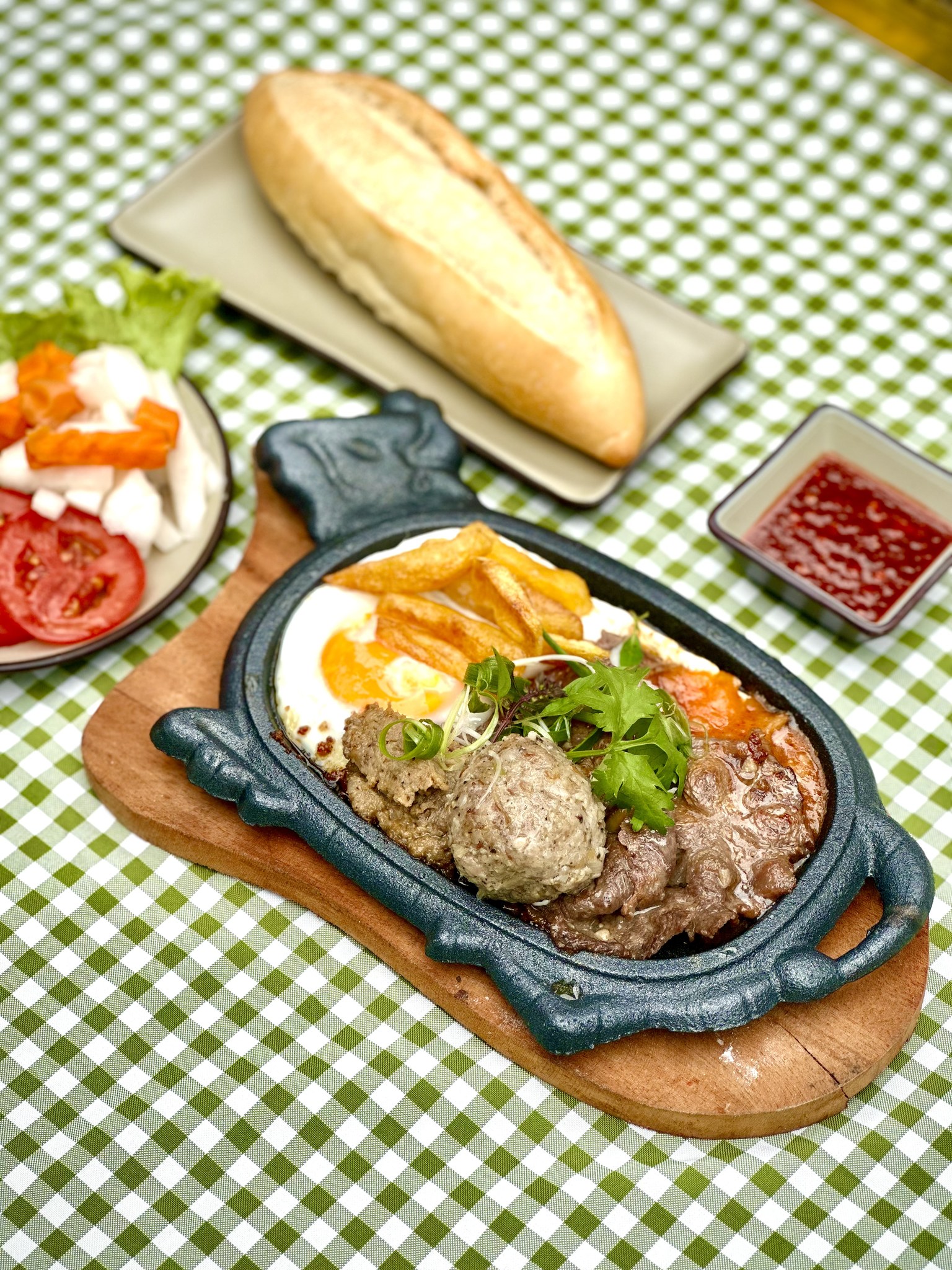 Our most popular dish! Sizzling beef steak with eggs served in a hot skillet with fresh herbs, vegetables, and crispy baguette. The aroma and sound will wake up your senses perfectly.